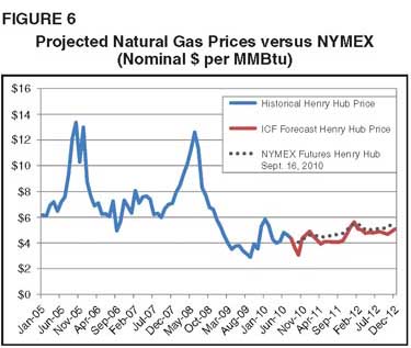 Although gas prices should strengthen as the economy mends, they could temporarily fall to $3.00-$3.50/MMBtu late this fall as storage fills. However, prices should firm rather quickly into the $4.00-$4.50 range as the 2010-11 winter heating season gets under way and remain at that level throughout most of next year, assuming normal winter and minimal hurricane disruptions. We then see prices rising to $4.50-$5.00/MMBtu in 2012, and eventually working their way above $5.00/MMBtu (Figure 6).