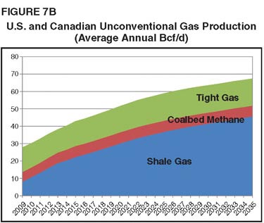 Consistent with 1.0 Bcf-1.5 Bcf/d per year demand growth for electric generation, U.S. and Canadian supply is projected to grow from 72 Bcf/d in 2009 to 85 Bcf/d by 2020. In total, onshore unconventional production should grow from 38 percent of total gas supply in 2009 to 63 percent by 2035. As shown in Figure 7B, shale gas is the largest source of that growth in unconventional supply, accounting for more than 90 percent of the increase. We expect shale gas production to triple over the coming decade, from 9.0 Bcf/d in 2009 to almost 30.0 Bcf/d by 2020. Half of the growth will come from the Haynesville and Marcellus shales, assuming that permitting or regulatory restrictions on drilling and fracturing do not significantly impact development.