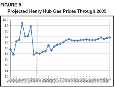 According to our forecast, Henry Hub prices will average $4.00-$5.00/MMBtu over the next few years, but increased demand in power generation and other market forces should lead to a rather pronounced rebound in 2013-14, when the supply/demand balance tightens. There will be some volatility and cycling between demand and prices, but the market eventually should move into a prolonged period where Henry Hub prices average $6.00-$7.00/MMBtu in real terms (Figure 8).