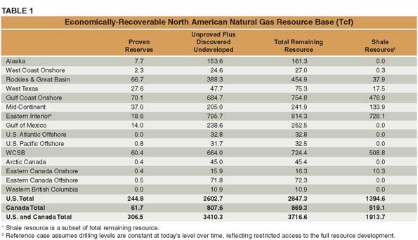 There is no question that the gas is in place at the right economics. The estimates in Table 1 show in aggregate the amount of resource that is economically viable to develop using existing technologies. The numbers were developed through a comprehensive study with producers that included analyzing detailed geologic data on various shale basins. The results indicate there is about 300 Tcf of economically viable proven reserves in North America, with 80 percent located in the United States.