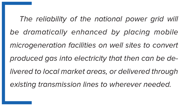 While the concept of “distributed generation” powered by natural gas has been around for some time, in practice, it represents a very small slice of the total domestic power generation pie. The security and reliability of the national power grid will be dramatically enhanced by placing mobile microgeneration facilities on well sites to convert produced gas into electricity that then can be delivered to local market areas, or delivered through existing transmission lines to wherever needed. It will reduce the need for expensive new construction pipeline and power line infrastructure projects, and the generated electricity will be available on call to meet dynamic demand loads.