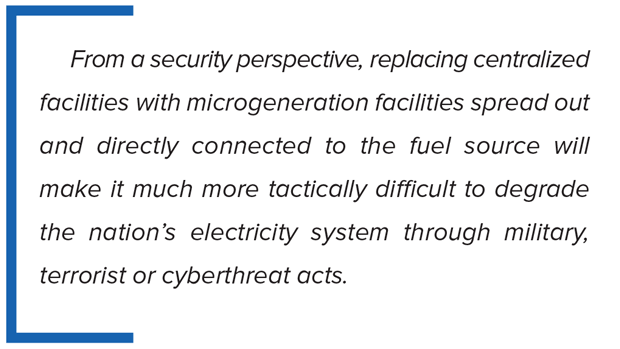 The answer should include careful consideration of rebuilding the grid to be more robust and compartmentalized by distributing generation among many gas-producing sites. This will streamline infrastructure requirements and enhance reliability by creating substantial redundancies with numerous generating locations across large geographic areas. From a security perspective, replacing centralized facilities with microgeneration facilities spread out and directly connected to the fuel source makes it much more tactically difficult to degrade the nation’s electricity system through military, terrorist or cyberthreat acts.