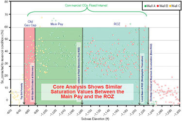 Thurmond adds that it stands to reason that the saturation values appear to be the same in the MPZ and ROZ. “Considering that previous waterfloods have swept water through the main pay zone six times in most cases, it makes perfect sense that the saturation levels are practically identical to the ROZ,” he says.