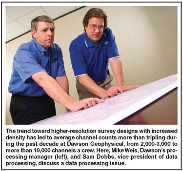 Only a decade ago, Jumper says Dawson Geophysical was averaging 2,000-3,000 channels a crew. Today, that number can be greater than 10,000. The increased density produces an effect on data processing requirements when it comes time to crunch the raw data. In addition, most 3-D data sets are now prestack time migrated, which also adds to the computational requirements. “I do not see any end to the increased intensity and size of data sets,” he offers.