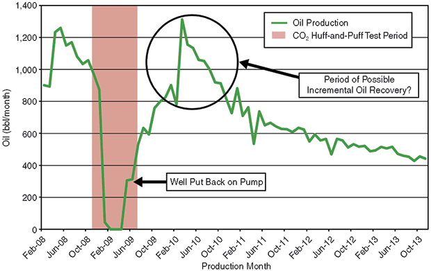 Oil production continued to rise slowly in early 2010, reaching a peak post-injection high approaching 44 bbl/d in March 2010 (a higher rate than was achieved during any of the 14 months immediately prior to the injection test). Conversations with the operators indicate that the higher production rate may be related to workover activities on the well as opposed to delayed CO2 effects.
