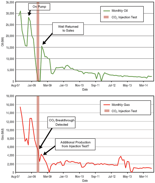 After rapidly climbing to peak production of 160 bbl/d eight days after opening the well, oil production settled into an average of 20 bbl/d during the first 30 days after the soak period. By the end of June 2009, the well was no longer flowing and was put on pump. Daily oil production did not return to the preinjection range until late 2009, nearly eight months after the well was opened.