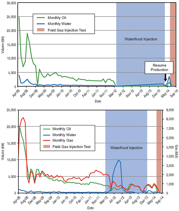 A third Parshall Field well operated by EOG, the NDIC 16986, has been the subject of both produced water and field gas injection testing. Water injection was conducted periodically from April 2012 to February 2014 in a “waterflood pilot.” Figure 3 shows fluid production data for the injection well and nearby offset well NDIC 16461. Nearly 439,000 barrels of water were injected before the well was returned to production in March 2014.