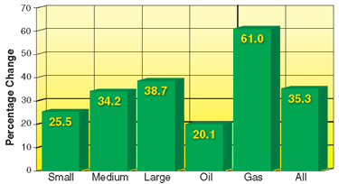 For the second consecutive year, survey respondents are predicting better than a one-third increase in the number of wells drilled, following last year’s projection of a 38.2 percent increase in drilling with a 35.3 percent increase this year (Figure 1). Interestingly, “gas-well drillers”–those that targeted natural gas with more than half their 2010 wells–are the most optimistic, projecting a 61.0 percent increase in drilling. This compares with a 20.1 percent increase predicted by those who targeted crude oil with more than half their 2010 wells (“oil-well drillers”).