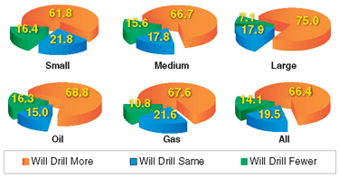 The large driller category continues to be the most aggressive among the size groupings, with 71.4 percent of large drillers anticipating bigger drilling budgets in 2011, compared with 65.2 percent of medium drillers and 61.8 percent of small drillers.
