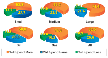 Among all survey respondents, 62.5 percent say they will increase their drilling budgets in 2011, 26.6 percent expect them to stay the same, and 10.9 percent will spend less.
