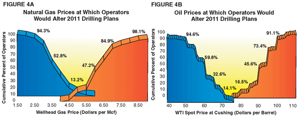 Percentages in Figures 4A and 4B represent the cumulative total of survey respondents who indicate they would have altered their 2011 drilling plans by the time the wellhead natural gas price (Figure 4A) or the spot price for West Texas Intermediate crude oil delivered at Cushing, Ok. (Figure 4B), reached the indicated amount. Prices at which drilling would decrease are plotted to the left of the graphs in downward curves; prices at which drilling would increase are plotted to the right of the graphs in upward curves.