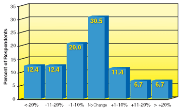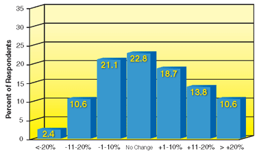 Looking at crude oil production (Figure 6), 10.6 percent of survey respondents put their 2010 production more than 20 percent ahead of 2009, 13.8 percent report oil production up 11-20 percent, and 18.7 percent say it rose 1-10 percent. Meanwhile, 2.4 percent of respondents say their oil production declined more than 20 percent, 10.6 percent report oil production down 11-20 percent, and 21.1 percent say oil production slipped 1-10 percent.