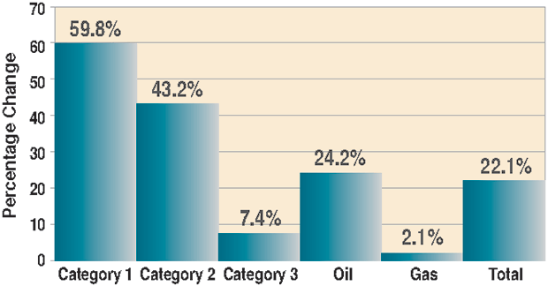 According to those data, survey respondents expect to drill 22.1 percent more wells this year than last (Figure 1), led by a 59.8 percent increase projected by Category 1 respondents: those who anticipate drilling 0-5 wells in 2019. Category 2 respondents (those that anticipate drilling 6-10 wells in 2019) are predicting a 43.2 percent increase, while Category 3 respondents (11 or more wells in 2019) project a 7.4 percent increase.