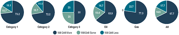 Again, Category 1 drillers are the most optimistic, with 73.2 percent saying they plan to drill more wells this year than last. Category 2 drillers aren’t far behind, though, with 72.2 percent saying they will drill more, while exactly half of Category 3 drillers say they will drill more.