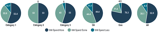 Category 1 respondents are those that plan to drill five or fewer wells in 2019. Category 2 respondents say they will drill 6-10 wells this year, while Category 3 respondents expect to drill 11 or more. Respondents included in the “oil” category drilled only oil wells in 2018 and expect to drill oil wells only in 2019, while the “gas” category includes all respondents that drilled any gas wells last year or anticipate doing so this year.