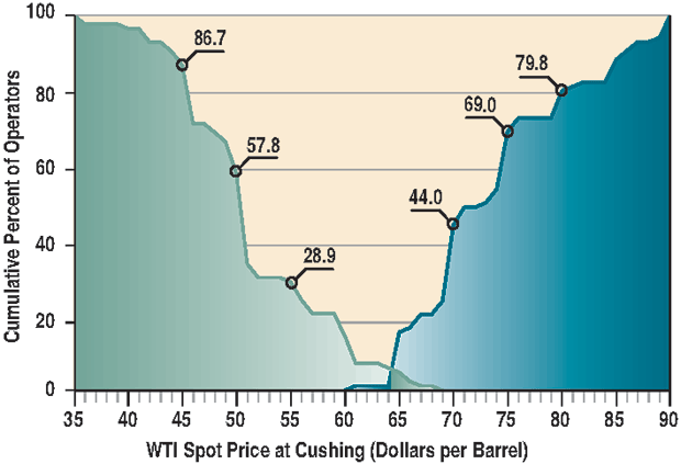 Percentages in Figures 4A and 4B represent the cumulative total of survey respondents that indicate they would have altered their 2019 drilling plans by the time the spot price for West Texas Intermediate crude oil at Cushing, Ok. (Figure 4A), or the wellhead natural gas price (Figure 4B) reached the indicated amount. Prices at which drilling would decrease are plotted to the left of the graphs in downward curves; prices at which drilling would increase are plotted to the right of the graphs in upward curves.