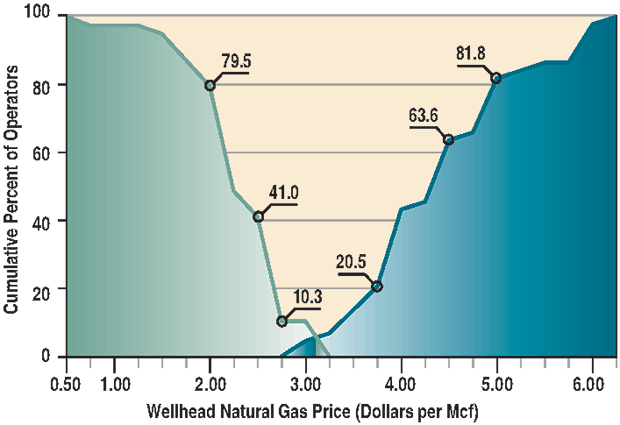 For natural gas, the key inflection points are $4.00 on the upside and $2.50 on the down (Figure 4B). Whereas only about one-fifth of respondents to the Survey of Independent Operators say they will increase drilling at a $3.75 gas price, 43.2 percent indicate they will do so at $4.00 an Mcf, and 63.6 percent will drill more wells at $4.50. Should natural gas prices reach $5.00 an Mcf, 81.8 percent of survey respondents say they will drill more wells.