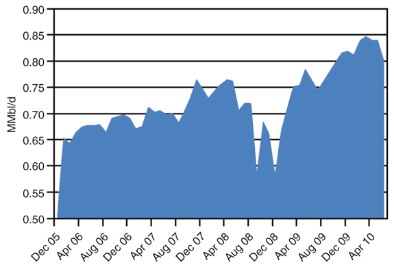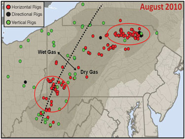 One producing region with fast-growing natural gas production and the potential for significant increases in liquids volumes is the Marcellus Shale. Considered the largest shale formation in the world, the Marcellus is one of North America’s greatest natural gas resources, with vast reserves, low per-unit development and production costs, and close proximity to premium East Coast markets. After Range Resources Corporation established economic production from early Marcellus wells in 2005, development activity and production have expanded rapidly. Based on rig counts and pipeline flows, total Marcellus production conservatively is projected to reach 5 billion cubic feet a day by the end of 2014, and some forecasts anticipate as much as 10 Bcf/d.