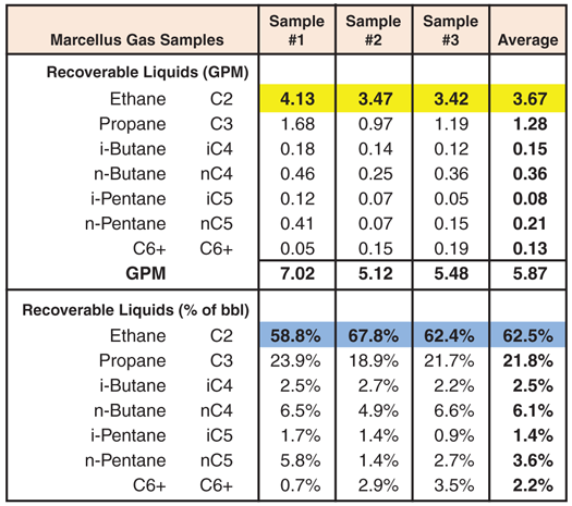 The magnitude of the ethane issue is illustrated by the production data in Figure 2, which shows the recoverable liquids content in three gas samples representing some of the newer Marcellus wells. Total liquids content in the first sample is about 7.0 gallons per Mcf of gas, while the second and third samples are in the 5.0 gal/Mcf range. Some regions are leaner, such as Butler County in extreme southwest Pennsylvania (3.5-4.0 gal/Mcf), and some are richer, such as northern West Virginia (close to 9.0 gal/Mcf).