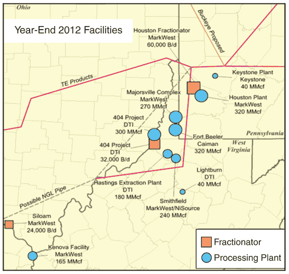 There are currently three large processing plants in the Marcellus region with a combined capacity of 500 MMcf/d–MarkWest’s Houston complex in southwest Pennsylvania and Kenova facility in Wayne County, W.V., and Dominion’s Hastings plant in Wetzel County, W.V.–as well as another 17 small plants, the majority of which are refrigeration facilities. As shown in Figure 3, major processing capacity additions are under development. All of the planned new plants are turbo expander facilities.
