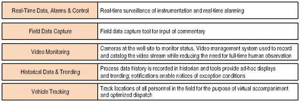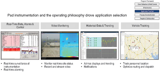 The team determined that many human inspections could be eliminated by installing three video cameras on each pad to observe flares continuously, and process trains, wellheads, etc., especially at high-priority locations. However, the large data volumes required video management software to high grade events such as leaks or pad entries, and to notify technicians. Figures 3A and 3B show the application tool set selected and detailed application scoping.