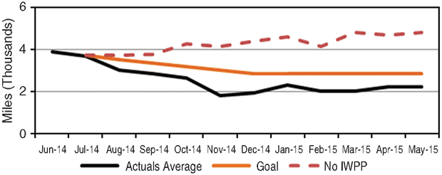 Recognizing that decreasing road miles would lead to reduced HS&E risks as well as improved productive time for operations technicians, the pilot targeted a 25 percent reduction in travel. The projected mileage based on well count would have been in excess of 4,500 miles each month without the IWPP. The project is reporting a monthly mileage reduction of more than 50 percent (Figure 5A).