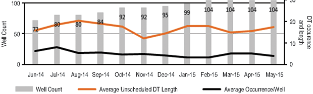 The average number of downtime events per well each month has decreased from nine to five. Again, this 44 percent improvement far exceeds the pilot project’s 10 percent target objective. The duration of the average unscheduled downtime event has improved by 25 percent (from 20 to 15 hours), as shown in Figure 5B.