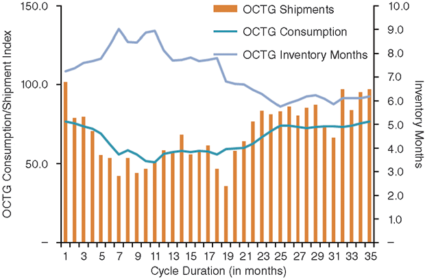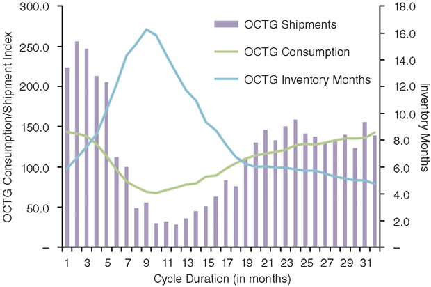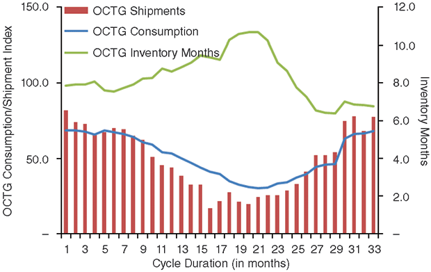 In addition, the OCTG consumption curve only spent a few months at the bottom, and had recovered to its precycle level within a year. That said, in this case, shipments spent about 16 months below the consumption level and four months below consumption levels after the OCTG curve hit bottom. The total length of the cycle from peak, precycle OCTG consumption to a return to that level was 33 months.