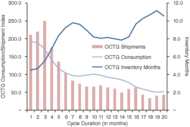 As Figure 2 shows, consumption was relatively flat from about month seven to month 20. In this case, OCTG shipments spent six months below the consumption level with three of those months coming after the OCTG curve hit its lowest point. Recovery to precycle consumption took close to two years.