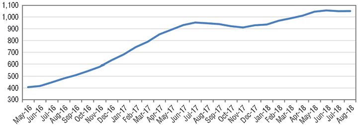 Good–but not tremendous–fundamentals, combined with a take-away bottleneck in the Permian Basin, resulted in a relatively flat U.S. rig count through mid-August (see Figure 1). Analysts at Simmons & Company International® | Energy Specialists of Piper Jaffray® division, expect the rig count to grow moderately for the balance of the year for a 2018 average of 1,032. We generally concur with that view.