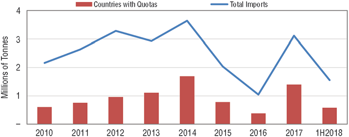 Still, the quotas are not zero. In fact, for all but Korea, the quotas are not restrictive of supply when compared with 2017. Korea, however, which accounted for 34 percent of import supply in 2017 (17 percent of total supply) is limited by quotas to about half of last year’s volume. Given that, it is not surprising that some are concerned about supply.