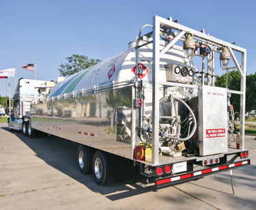 Encana Corp. is replacing gasoline-powered pickups and SUVs in its work fleet with bifuel vehicles, as well as converting drilling rigs and eventually even hydraulic fracturing trucks. The company has 16 natural gas-fired drilling rigs working throughout its North American operations, and estimates a savings of $1 million a year for each larger-horsepower rig using natural gas instead of diesel. Encana also is building fueling infrastructure in both the United States and Canada, including this mobile LNG station for servicing heavy-duty trucks in the Haynesville Shale play.