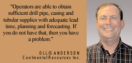 Continental Resources’ Anderson agrees that planning is the key. “Operators are able to obtain sufficient drill pipe, casing and tubular supplies with adequate lead time, planning and forecasting,” he says. “If you do not have that, then you have a problem. And even with adequate planning, operators still may experience shortages because of delivery failures.”
