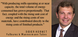 “With producing mills operating at or near capacity, the total volume of energy consumed has grown proportionally,” explains V&M Tubes’ Hornet. “That fact, coupled with the rising unit cost of energy and the rising costs of raw materials, has contributed directly to the rising costs of finished products. Energy impacts final costs in many ways. These include the costs to operate electrical steel-making facilities, gas and electrical heat-treating lines, basic plant operations, and transportation costs related to rail or truck.”