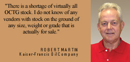 Robert Martin, who oversees all OCTG management for Kaiser-Francis Oil Company in Tulsa, agrees. “There is a shortage of virtually all OCTG stock,” he says. “I do not know of any vendors with stock on the ground of any size, weight or grade that is actually for sale. Most all the majors and large independents have entered into stocking programs with OCTG primary stocking distributors, which have tied up all the existing inventories of OCTG as well as the majority of mill rollings coming this fall and winter at ‘unknown’ prices.”