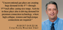 “Unconventional gas plays utilizing horizontal drilling techniques and multizone hydraulic fracture operations are creating huge demand in the 41/2- through 95/8-inch alloy casing size range,” responds Okrzesik. “Activity in these plays also is driving demand for premium connection technology, where high-collapse, tension and high-torque connections are required in the casing strings. There continues to be interest for even higher collapse OCTG grades. Evraz is focusing on developing higher collapse grades beyond P110 at our ERW OCTG facilities in Canada and our seamless OCTG facilities in the United States. That is what customers need in these multifrac, high-pressure, horizontal plays.”