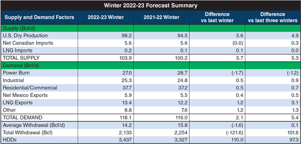 WASHINGTON–Even though U.S. natural gas production is forecast to increase by 4% year-over-year this winter, the Natural Gas Supply Association’s annual Winter Outlook projects upward pressure on natural gas prices compared with the 2021-22 heating season mainly because of the combination of below-average storage and an estimated 2% increase in overall demand.