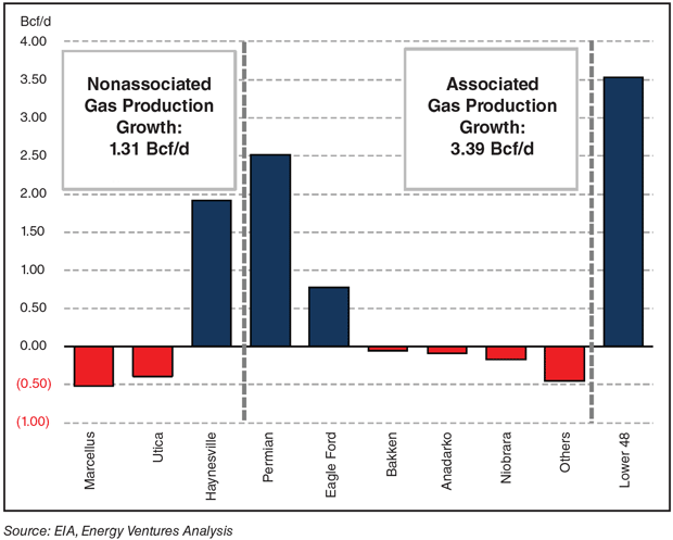 - Supply-side growth resulting in a 4% increase in domestic gas production, driven by output gains primarily in the Haynesville Shale and associated gas from Permian Basin tight oil plays (Figure 2); and
