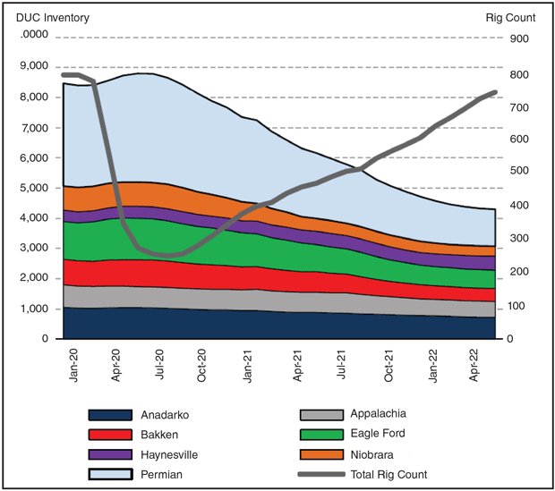 While stronger prices are likely to incentivize new well drilling in the short term, the ability to bring production on quickly is somewhat limited by the steady decline of the number of drilled, but uncompleted wells in inventory. The number of DUCs has been falling at a 4% monthly rate since April 2021, incentivizing the new drilling necessary to maintain or expand current output. The decline in the DUC inventory is yet another indicator of increased natural gas activity (Figure 3).