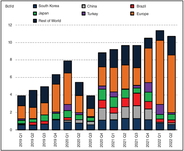 U.S. LNG has become an increasingly important strategic energy source in Europe (Figure 4). The percentages of U.S. LNG cargoes flowing to Europe expanded from 18% in the third quarter of 2021 to more than 50% in the first quarter of 2022, as European gas prices gained strength on Russian supply risk, trading at a premium above the Asian LNG benchmark JKM.
