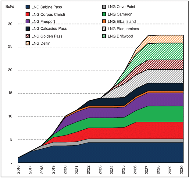 Based on the current forward market settlements, estimated netbacks of U.S. LNG exports to Northwest Europe and Northeast Asia remain above $30/MMBtu through 2023. In the near term, U.S. LNG feed gas demand will be constrained by nameplate capacity, and the next major expansion in LNG capacity is not expected until 2024-25 (Figure 5).