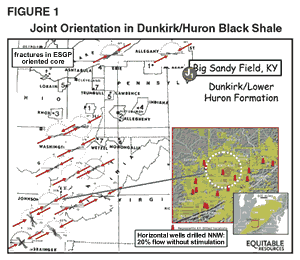 It is likely that these fractures are east-northeast striking fractures that were observed in core recovered by the Eastern Gas Shales Project (EGSP), a U.S. Department of Energy-sponsored investigation of gas potential in black shale in the Appalachian Basin. Figure 1 shows rose diagrams of the orientation of joints in ESGP core collected from the Devonian Dunkirk/Huron black shale of the Appalachian Basin. The east-northeast direction is indicated by red arrows, and the location of the Big Sandy Field is shown in the insert.