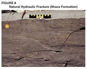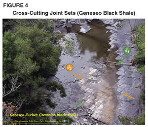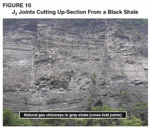 An example of J2 joints cutting up-section from a black shale (i.e., the Devonian Geneseo formation at Taughannock Falls State Park in New York into gray shales of the Ithaca formation of the Genesee Group) is shown in Figure 10. The height-to-spacing ratio of these joints is indicative of natural hydraulic fracturing.