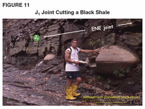 Several lines of evidence point to the propagation of both J1 and J2 as natural hydraulic fractures. First, tensile joints cleave carbonate concretions whereas the concretion acts as a barrier for natural hydraulic fractures. A natural hydraulic fracture will propagate around the concretion while leaving the concretion intact. Figure 11 is an example of a J1 joint cutting a black shale (i.e, the Devonian Rhinestreet along Eighteenmile Creek in Erie County, N.Y.) without cleaving carbonate concretions. This is one of the characteristic behaviors of a natural hydraulic fracture.