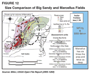 Production from the Huron/Dunkirk interval of the Big Sandy Field has enabled the USGS to predict an undiscovered resource of 6.3 Tcf. This field has less than 25 percent of acreage found within the boundaries of the Marcellus play (Figure 12), and the average depth of the Big Sandy Field is less than that of the heart of the Marcellus play. The scaling factor between the Big Sandy Field and the Marcellus play is about eight, which means that all else being equal, extrapolating the Dunkirk/Huron play suggests a total resource of the Marcellus play of nearly 50 Tcf. With this extrapolation, the USGS and Engelder-Lash estimates are in agreement.