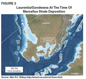 One of the most substantial plate boundaries during the past 500 million years of Earth history is that between the present continents of Africa and North America. Once these continents were part of larger lithospheric plates called Gondwana and Laurentia, respectively. Gondwana and Laurentia were separated by a large, but rapidly closing ocean 380 million years ago. Figure 2 shows the configuration of Laurentia and Gondwana at the time of deposition of the Devonian Marcellus Shale on the continental crust of the Appalachian Basin. Note the earth’s equator indicates that Laurentia is in the southern hemisphere and rotated clockwise from its present position on the globe.