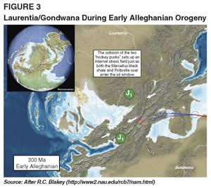 About 315 million year ago, Gondwana and Laurentia collided obliquely, and then slid past each other like hockey pucks for at least 15 million years. This glancing blow set up the stress field in the lithosphere of Laurentia that would control the orientation of fractures that formed in the Marcellus Shale and other rocks all along the 1,500-kilometer length of the Devonian-Mississippian Appalachian Basin.