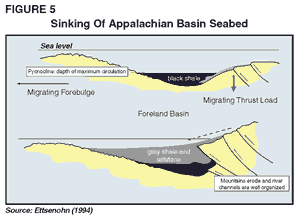 The Marcellus Shale accumulated on continental crust in a relatively shallow (less than 200 meters) interior seaway, perhaps because sea level was unusually high at this time, as indicated in Figure 2. At the time of deposition of the Marcellus Shale about 380 million years ago, Gondwana was rushing toward Laurentia at such a rate that thrust faulting caused crustal thickening in a highland at the edge of the continent. The drawing in Figure 5 shows the sinking of the Appalachian Basin seabed as a consequence of thrust loading during the convergence of Gondwana toward Laurentia. Thickening at the edge of Laurentia constituted a load that bent the continental margin much like the weight of a diver bends a diving board.