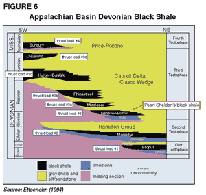 During crustal loading, the seabed of the Appalachian Basin sank below a pycnocline, a boundary in the ocean that separates warm, oxygenated surface water from cooler, oxygen-deficient water deeper in the ocean. An episode of thrust loading disrupted river systems so that, for a period, sediment flux into the basin was low, favoring the accumulation of rock with a high total organic carbon (TOC) content. Eventually, river channels organized to deliver clastic sediments at a higher rate so the gray shale covered the black shale. This cycle of thrust loading and concomitant black shale deposition repeated at least eight times during a period of 20 million years. Figure 6 shows the eight Devonian black shales found in the Appalachian Basin.