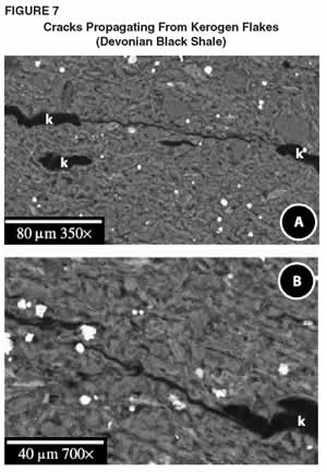 Figure 7 shows cracks propagating from kerogen flakes in Devonian black shale. These cracks are driven by pressure developed around the kerogen flakes by the chemical reaction that converts kerogen to gas and oil. As more hydrocarbon is generated, the cracks continue to grow until they open into full scale joints (i.e., J1) that are natural hydraulic fractures. Figure 8 is a natural hydraulic fracture driven by gas with the compressibility of methane–in this case, a J2 joint in the Ithaca formation of the Genesee Group exposed at Watkins Glen, N.Y. The rupture propagated from right to left, as indicated by plumose morphology showing two increments with surface roughness increasing until arrest.